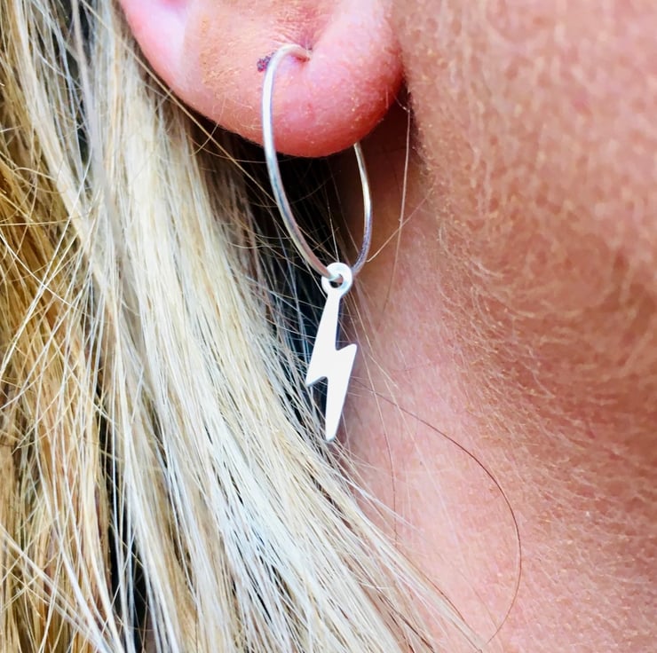 18mm sterling silver 925 hoops with 14mm sterling silver lightning bolt charms. Current best seller. Free gift box tied with ribbon.
