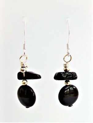 Semi-precious gemstone black onyx puffy flat round beads and nuggets feature in these earrings . They have been accented with silver plated round beads and have silver plated flattened shepherd style ear hooks.