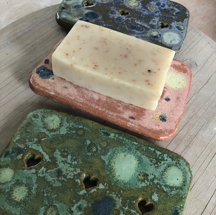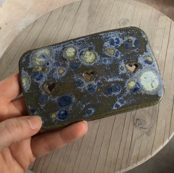 This flat soap plate has three heart holes pushed through it’s surface for efficient drainage. It is glazed in beautiful galaxy blue with white crystal bursts for more interest. It has rails underneath to lift it off your sink. It will hold comfortably most large bars of soap. And helps to make hand washing a little more interesting.
