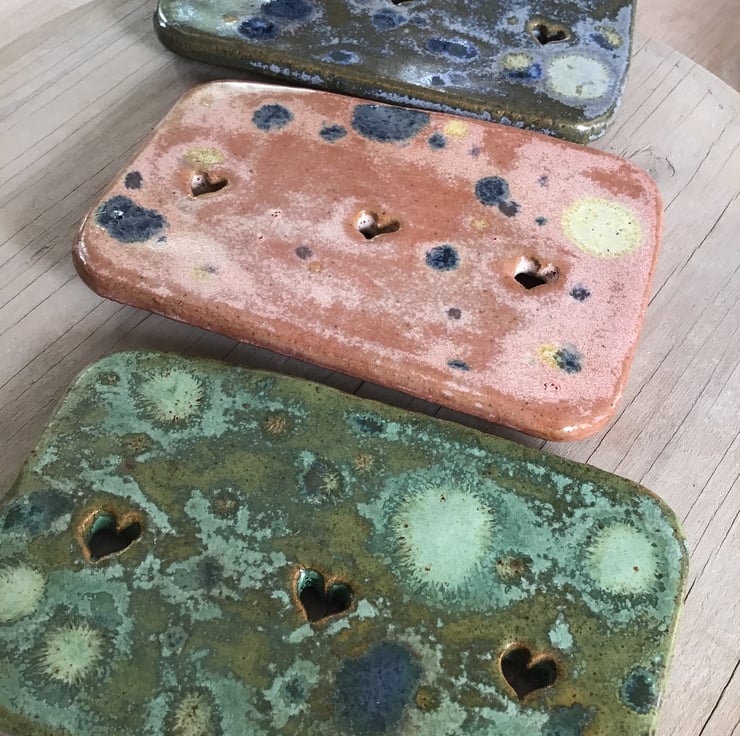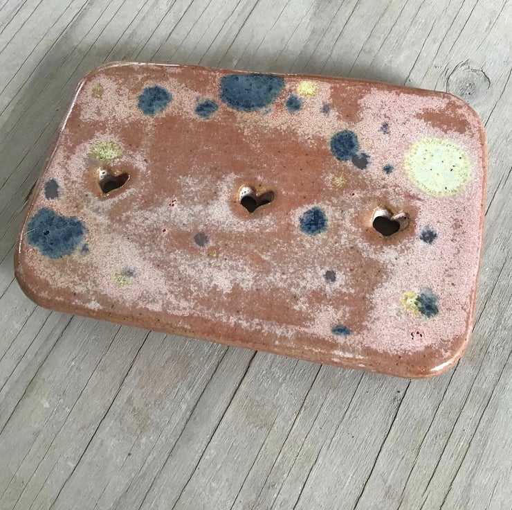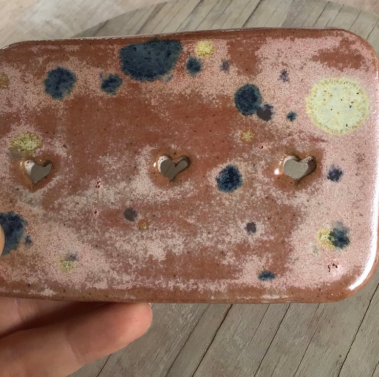 This flat soap plate has three heart holes pushed through it’s surface for efficient drainage. It is glazed in beautiful brick red with white crystal bursts for more interest. It has rails underneath to lift it off your sink. It will hold comfortably most large bars of soap. And helps to make hand washing a little more interesting.