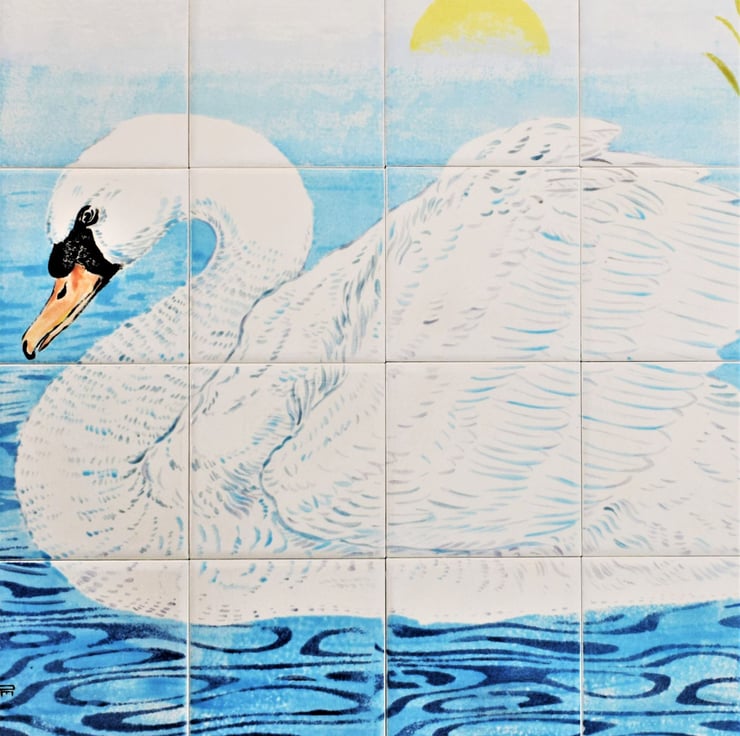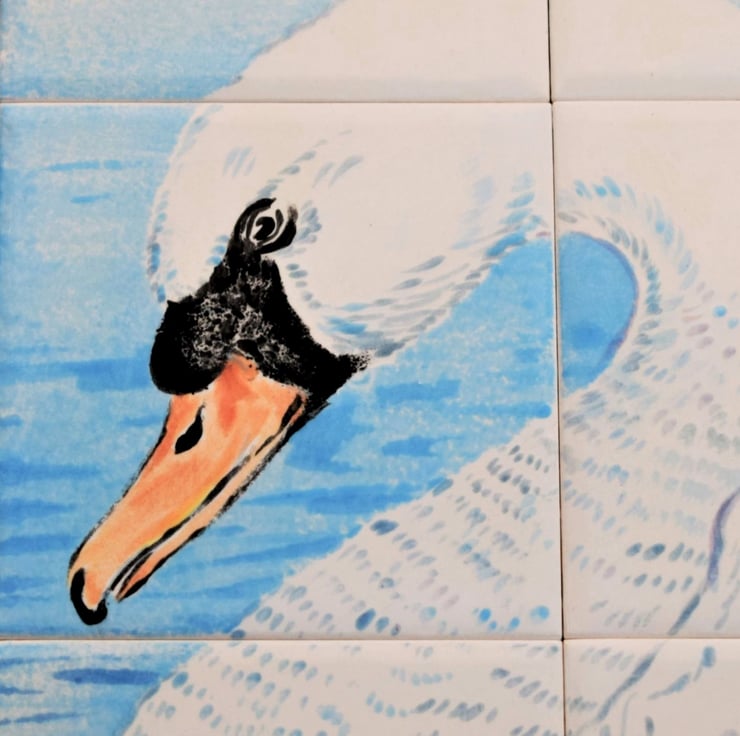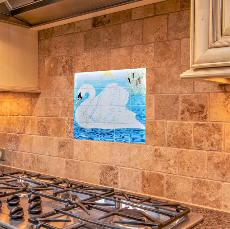 A beautiful hand-painted splashback tile mural, featuring a graceful swan.