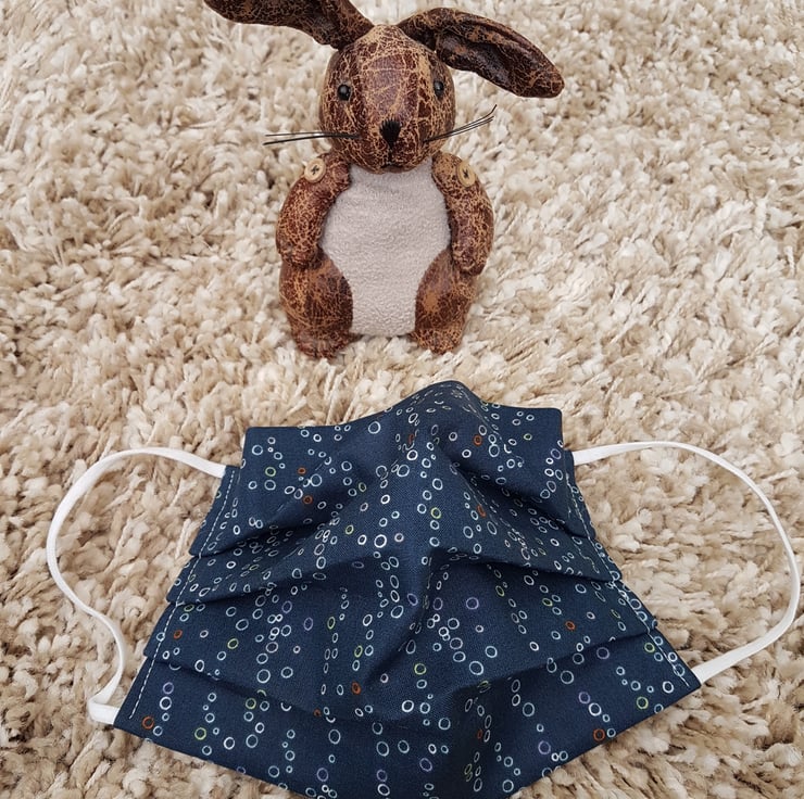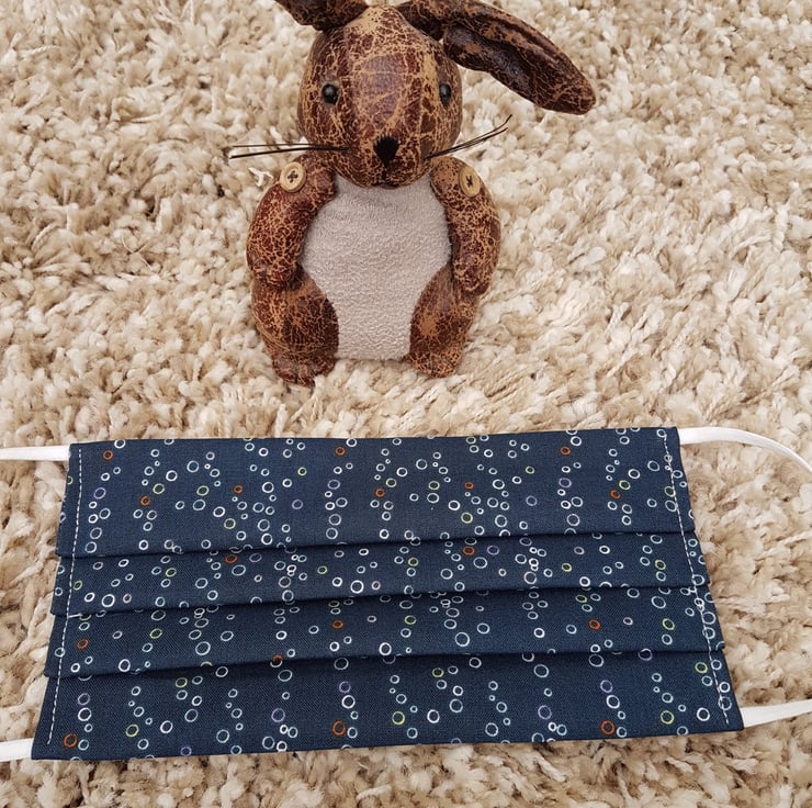 Adult face covering/mask made from a bubble print on navy fabric.The face mask is made with 2 layers of cotton forming an inner pocket for a filter (not included) and is fastened over the ears with 2 loops of elastic and a toggle adjuster.