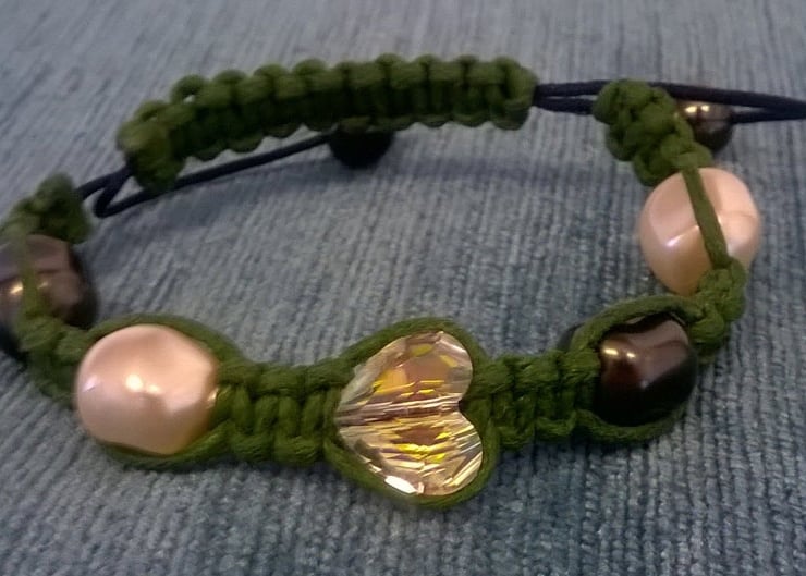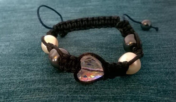 Swarovski Shamballa Bracelet made with 2 Swarovski glass baroque beads pearl cream 10mm 2 Swarovski glass baroque beads pearl black 10mm Swarovski crystal heart bead.