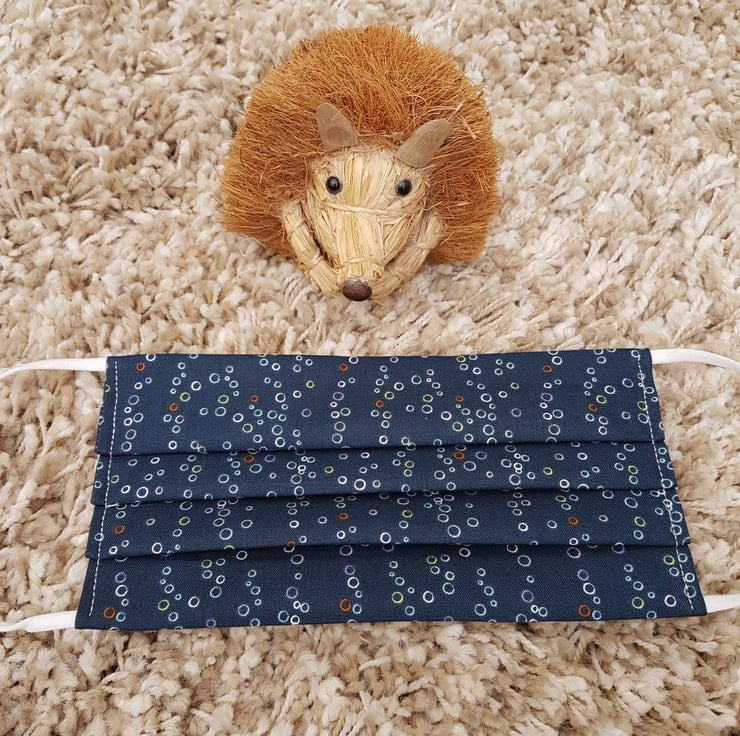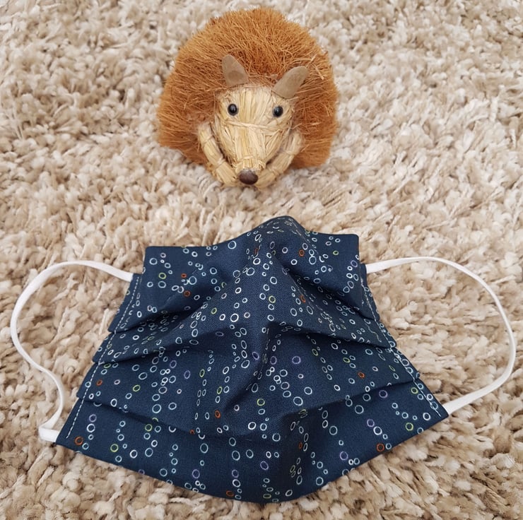 Small Adult/Teenager face covering made from a bubbles print on navy cotton. The face mask is made with 2 layers of cotton forming an inner pocket for a filter (not included) and is fastened over the ears with 2 loops of elastic and a toggle adjuster.
