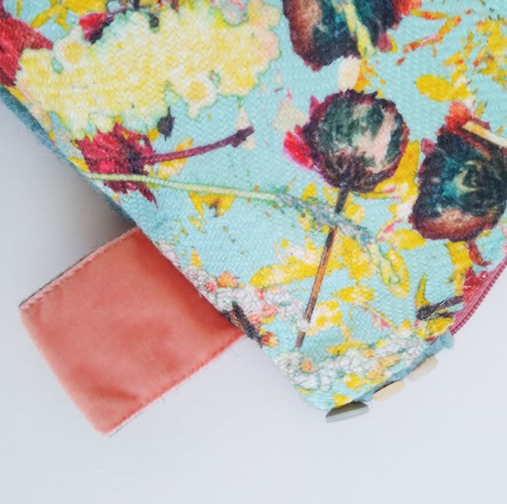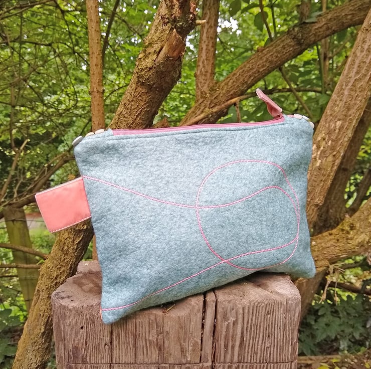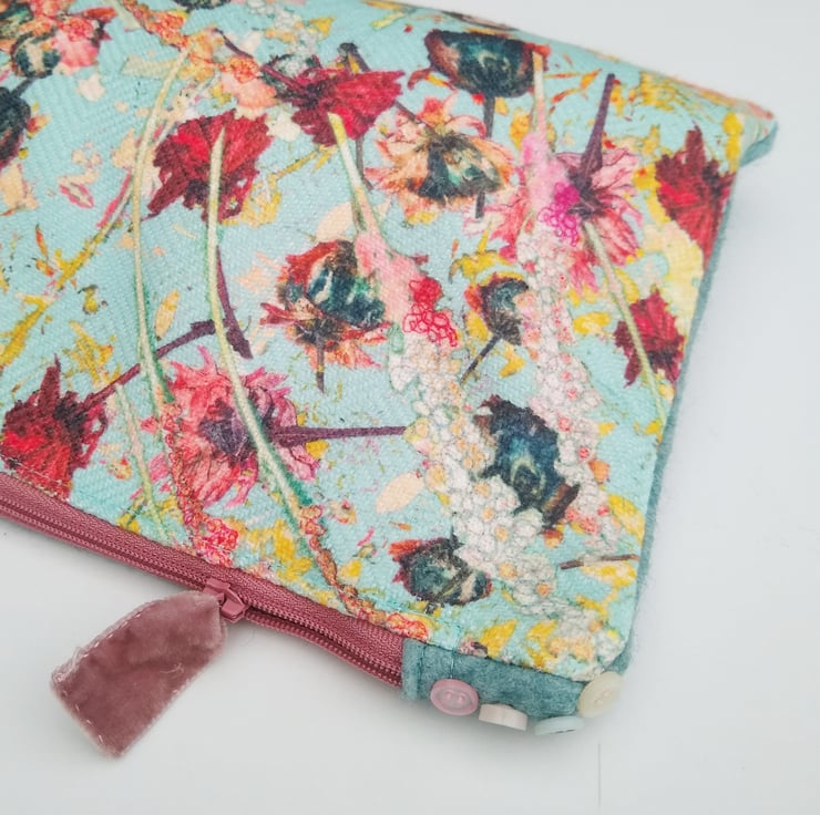 A handy zip pouch featuring my Sprigs and Roses design, printed in the UK onto herringbone tweed fabric. Backed in duck egg blue washed wool mix felt, lined in washed calico, and finished with embroidery thread, a velvet tab and buttons, it would make a unique and practical gift.