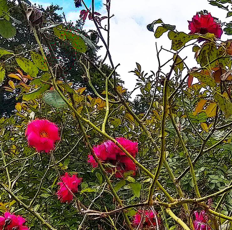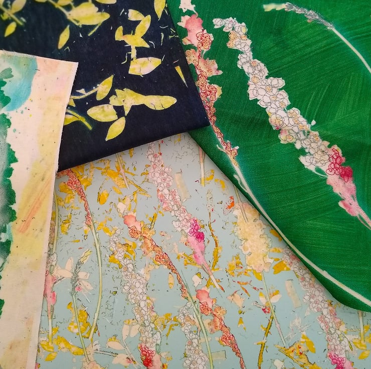 I live alongside the Montgomery Canal and the River Severn in Mid Wales, and area abundant with beautiful flora and fauna. My Sprigs and Roses design was developed by digitally manipulating images of flowers from my rather wild garden, along with my original heat transfers, to create a bold and colourful surface pattern.