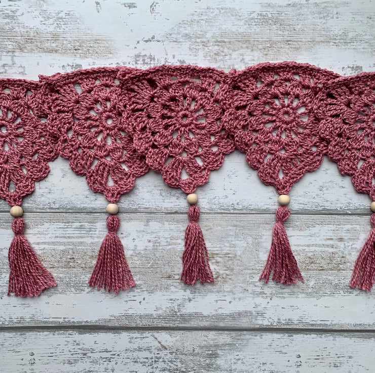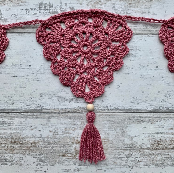 This beautiful crochet boho style bunting will brighten up your wall, fireplace, window or book shelves. It would also be a fantastic addition to a nursery or a vintage themed wedding.