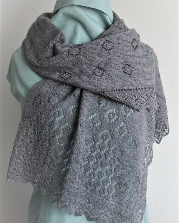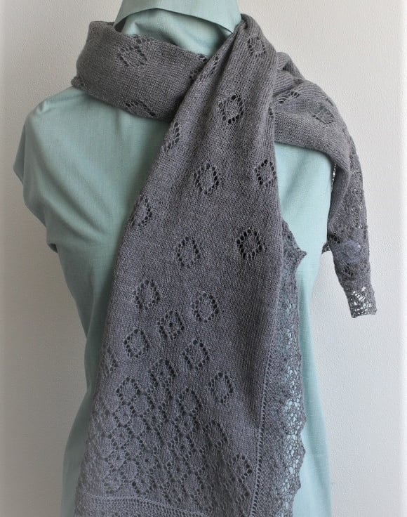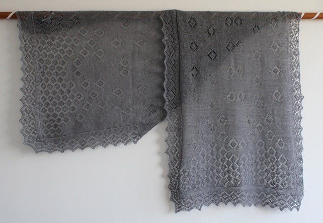 This Scarf/Wrap has been hand knitted to my own design in 100% merino wool. With lace patterning at the ends and a lace border the design is a more contemporary take on the traditional lace knitting. In the design I have utilised patterns and construction methods from the lace knitting traditions of Shetland and Orenburg.