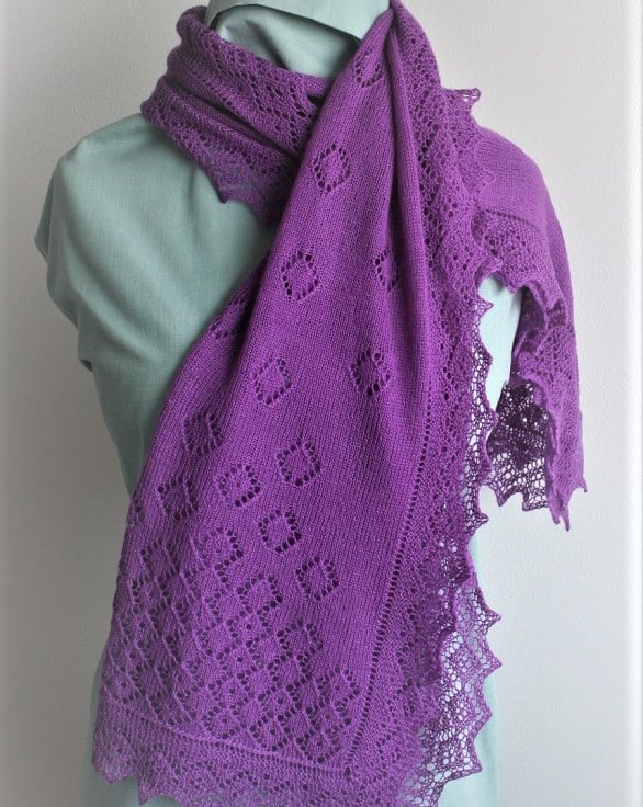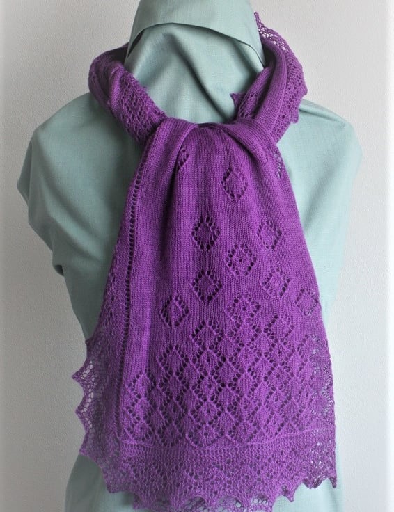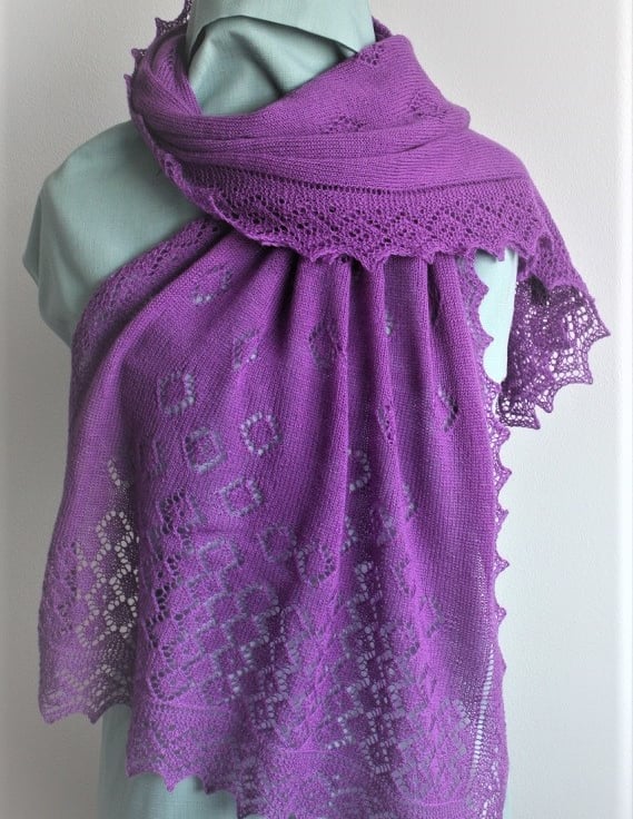 This Scarf/Wrap has been hand knitted to my own design in 100% merino wool. With lace patterning at the ends and a lace border the design is a more contemporary take on the traditional lace knitting. In the design I have utilised patterns and construction methods from the lace knitting traditions of Shetland and Orenburg.