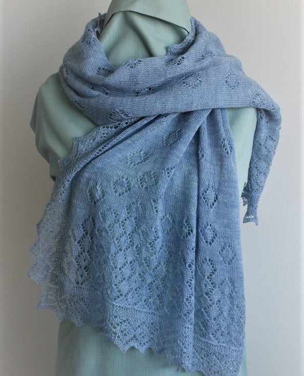 This Scarf/Wrap has been hand knitted to my own design in 100% merino wool. With lace patterning at the ends and a lace border the design is a more contemporary take on the traditional lace knitting. In the design I have utilised patterns and construction methods from the lace knitting traditions of Shetland and Orenburg.
