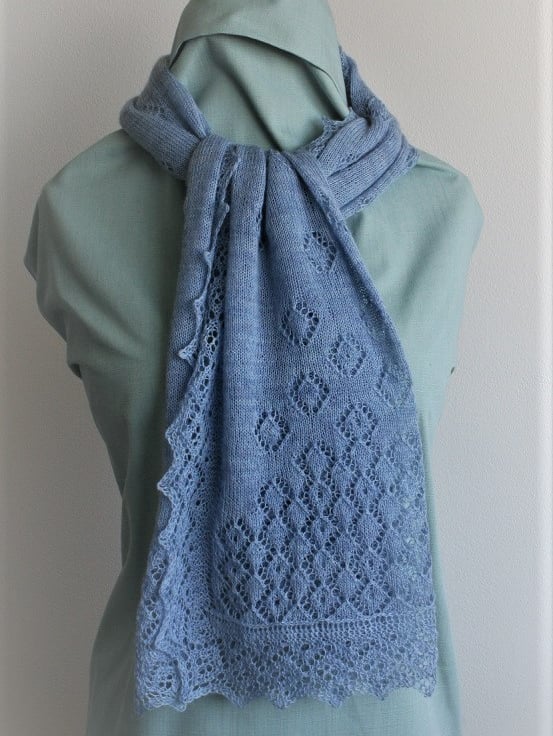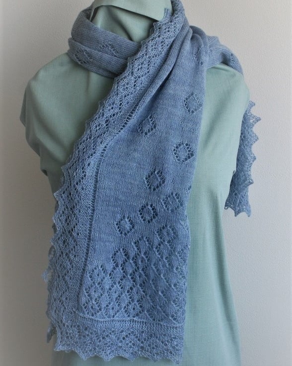 I have hand knitted the scarf in 1 ply merino yarn, which is spun in Italy. The high quality, luxurious yarn, produces a scarf that is wonderfully soft, light, and warm to wear.