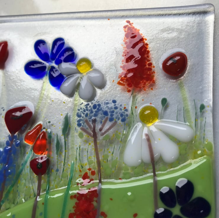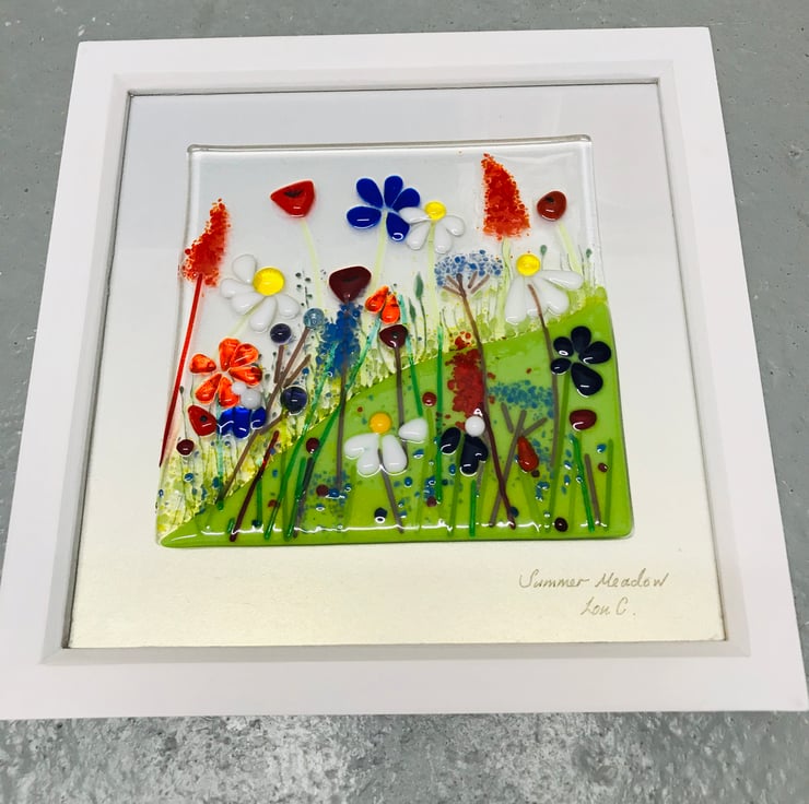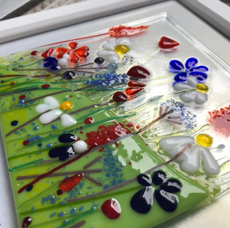 Fused glass flower meadows in bright and vibrant colours . 3 dimensional and smooth and shiney . 24 cm square white wood frame