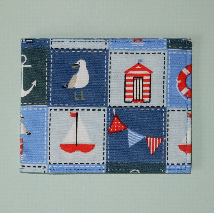 Just the thing to take on holiday to the seaside, anchors, sea gulls, beach huts etc. are featured on this hand made wallet for travel cards, train tickets, Oyster cards, bus pass or even credit cards. It measures approx. 3.5 x 3 inches folded and 7.5 inches open. It is lined in a toning star print.