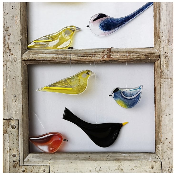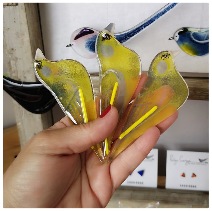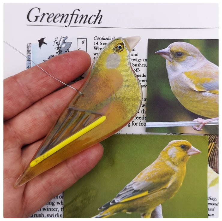 This listing is for one glass greenfinch made in my home studio in Bristol. It is roughly 10cm x 3.5cm in size. It is suspended on a piece of invisible thread so you can hang it from various places within the home.