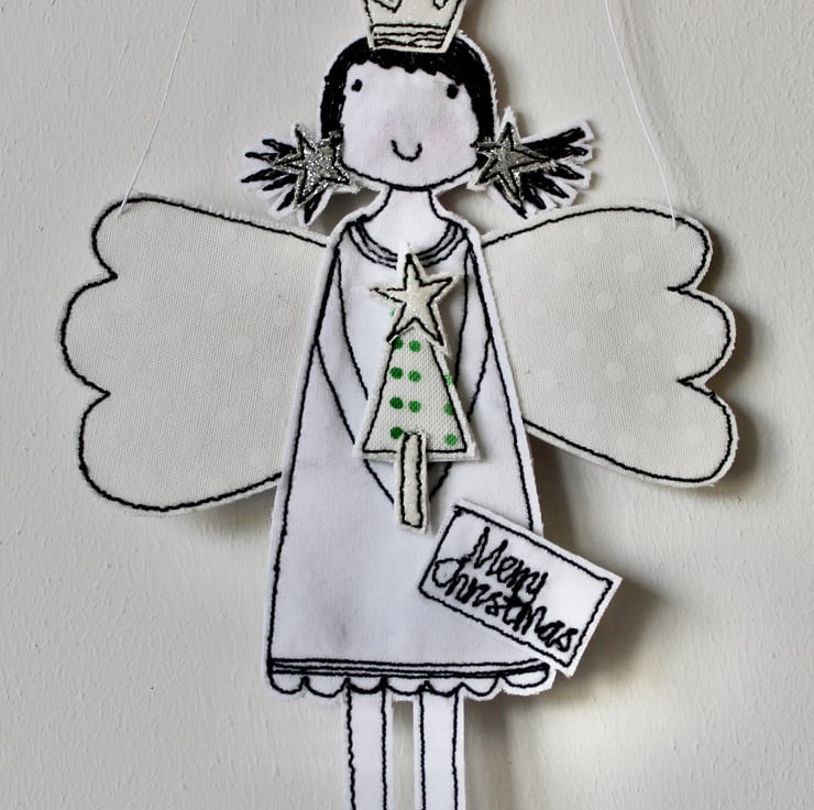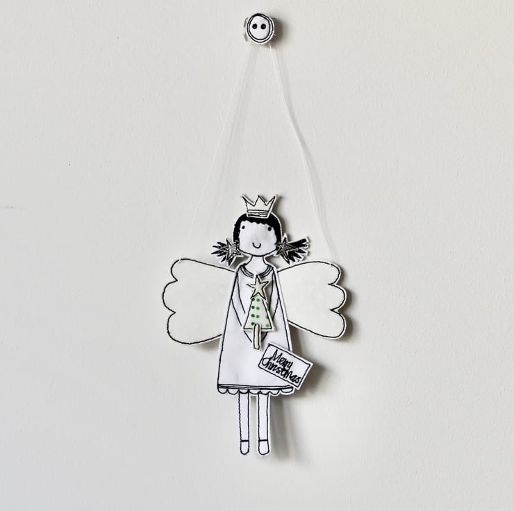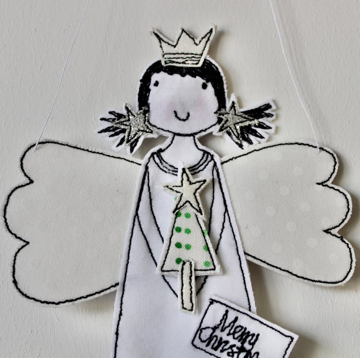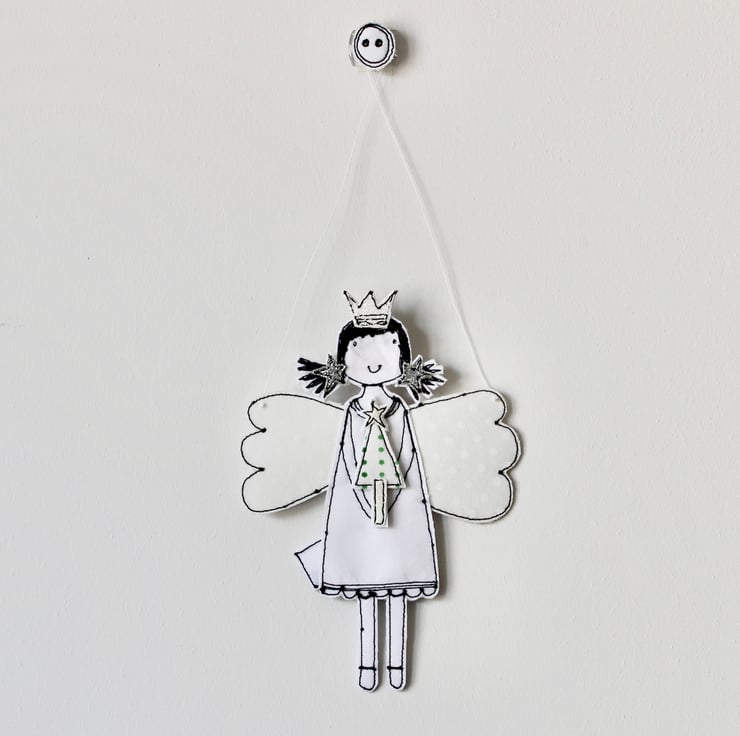 Each handmade fairy is sewn using cotton cloth, glitter cloth and free hand machine embroidery; multiple layers of cloth are sewn together and cut out by hand using very sharp scissors. With a linen thread to hang.