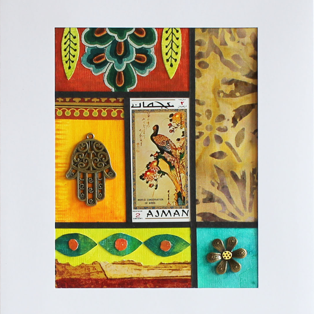 The mixed media panel is divided with paper strips. It has a postage stamp with a lovely painting of a Chinese pheasant in the centre. The surrounding panels contain collage, batik, jewelry findings and a filigree metal charm.