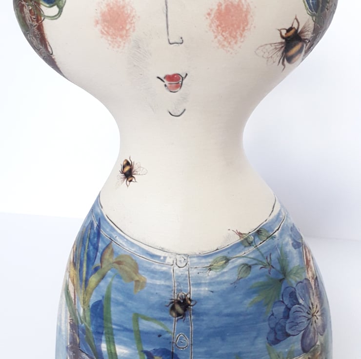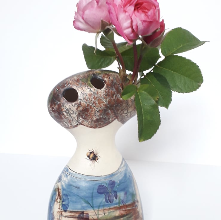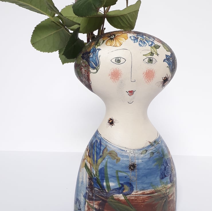 Hand built figurative vase measures approximately 23cms in height. Decorated with coloured slips and glazed in in a transparent. Ceramic decals of flowers and insects are added to give detail. Openings at the back of her head allow for dried flowers or grasses. Will be carefully packed and posted.