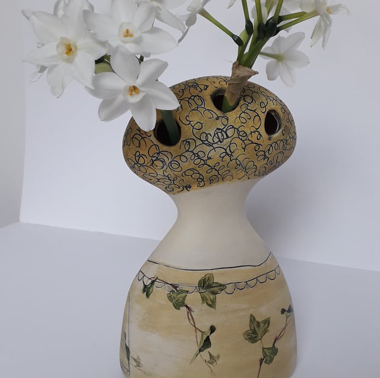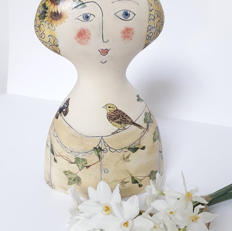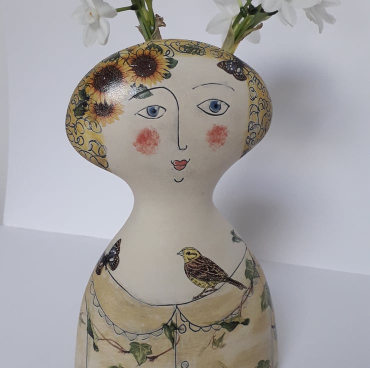 Hand built figurative vase measures approximately 23cms. Decorated with coloured slips and glazed in a transparent glaze glaze.Ceramic decals of bugs and flowers are fired on to add detail. Openings at the back of her head allow for dried flowers or grasses. Will be carefully packed and posted.