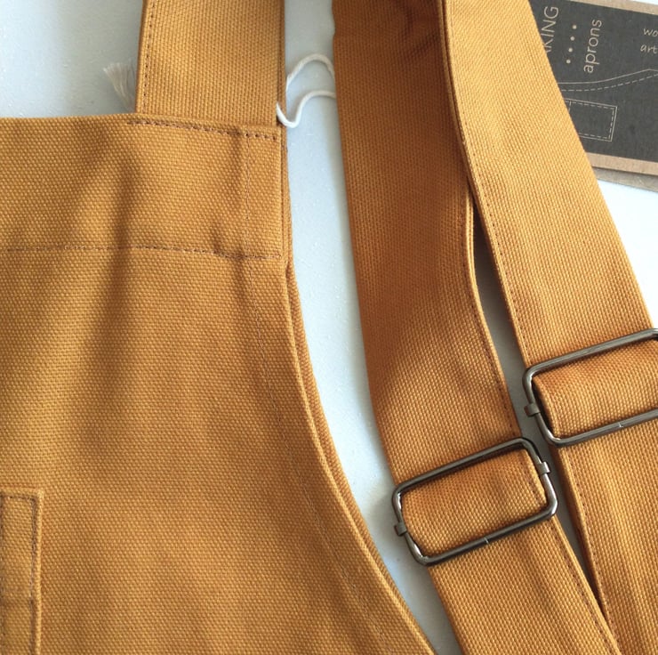 This gorgeous ochre pottery/makers apron is sure to attract admiration in the studio! It has a fantastically comfortable cross back design and split skirt with generous coverage making sure each leg is well covered working at a potters wheel or workbench. Beautifully sewn, carefully designed and made-to-last, this apron is highly specialised craftsperson's workwear.