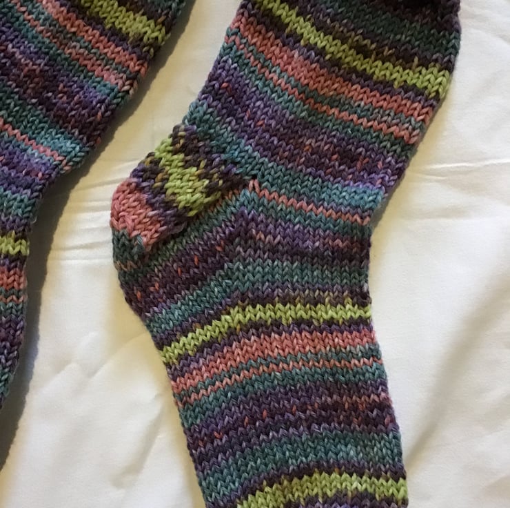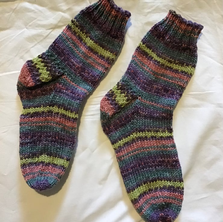 These socks are hand knitted in a 6 ply yarn, suitable for wearing with boots. They are mid calf length. The yarn is 25% nylon/ 75% wool, in a stripe pattern on blue pink green and purple. Hand wash recommended. They will fit a uk Ladies size 5-6. Handmade in Lancashire. Free uk shipping