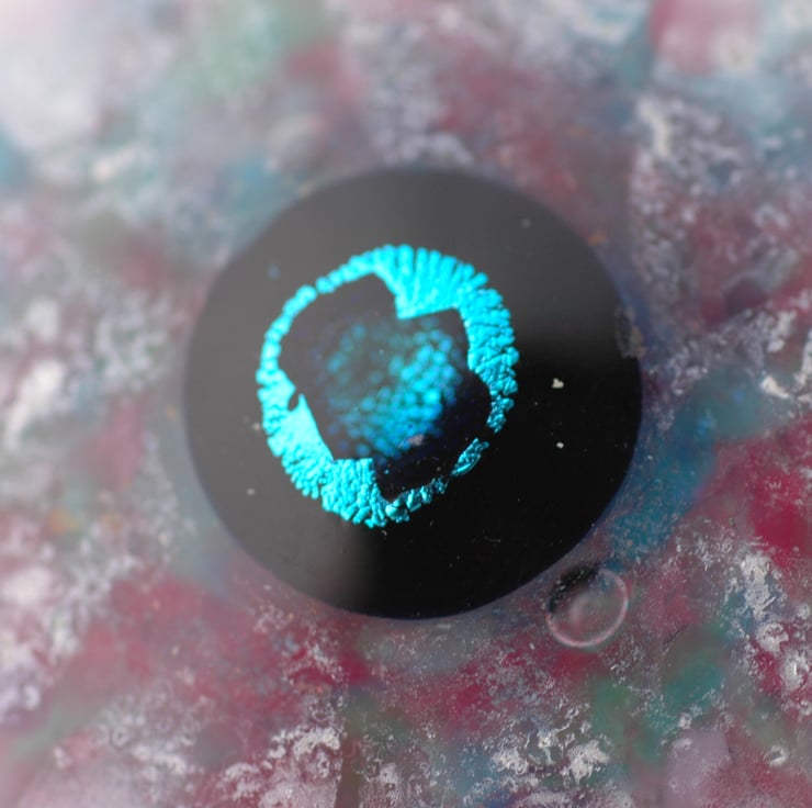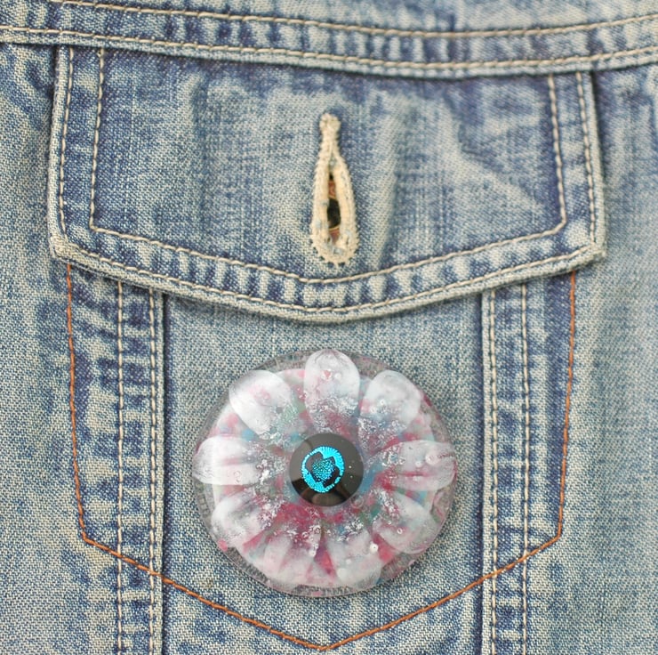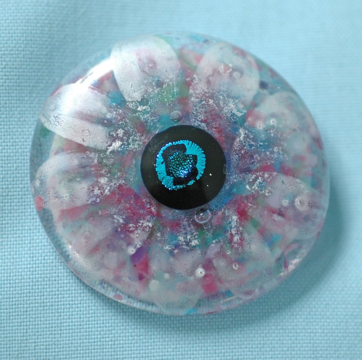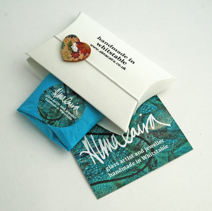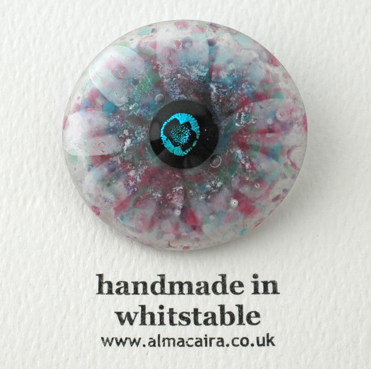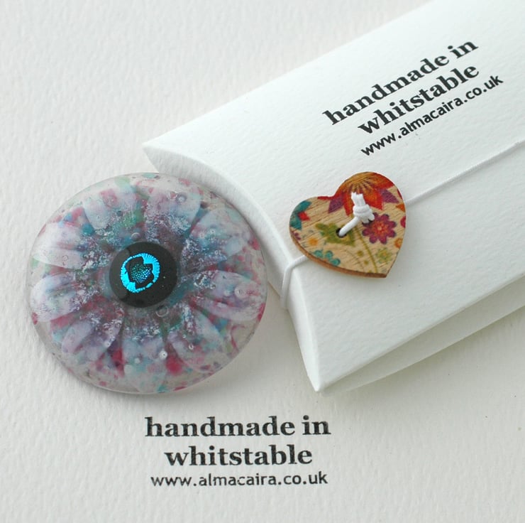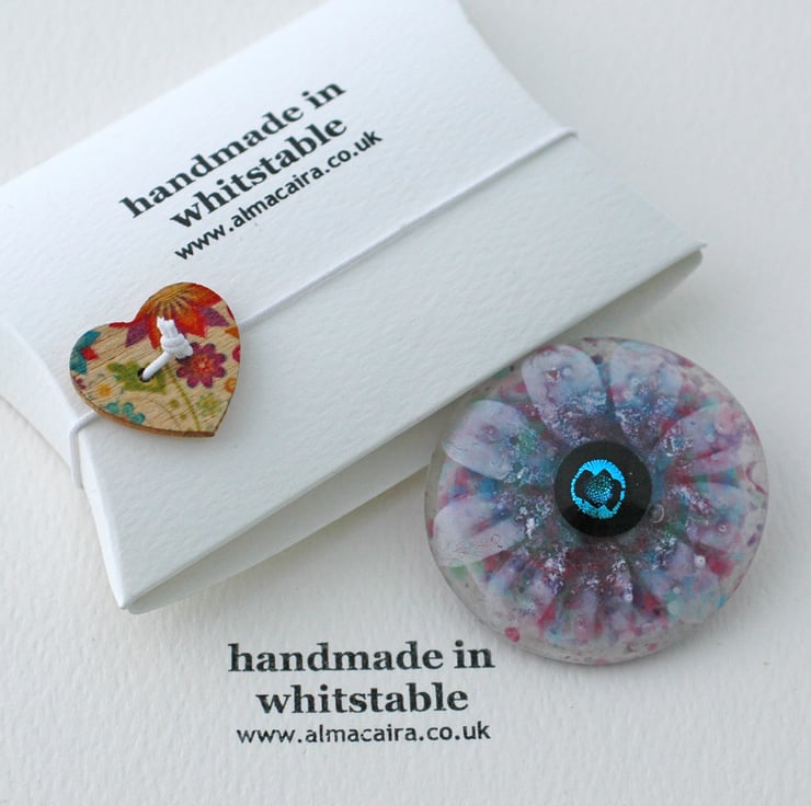 Created from layered Bullseye glass in my Whitstable workshop. This brooch has a beautiful, soft colour palette. The enamel painted flower has a muted metallic finish. Plated sterling silver brooch back glued with epoxy resin to create a permanent bond. Supplied with a recycled card gift box (sent flat for postage but very simple to assemble).