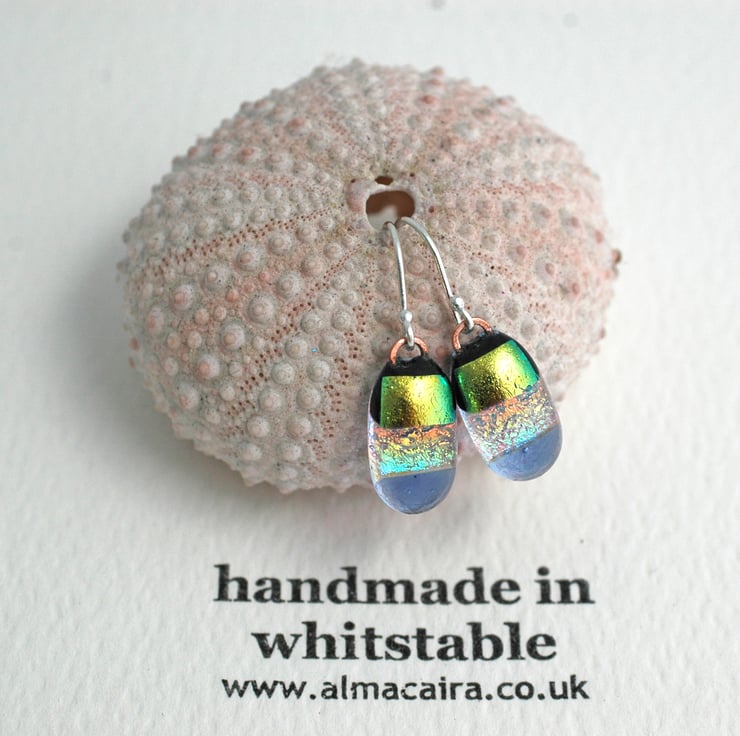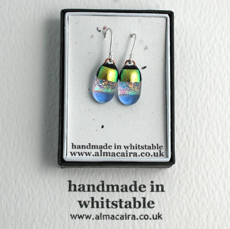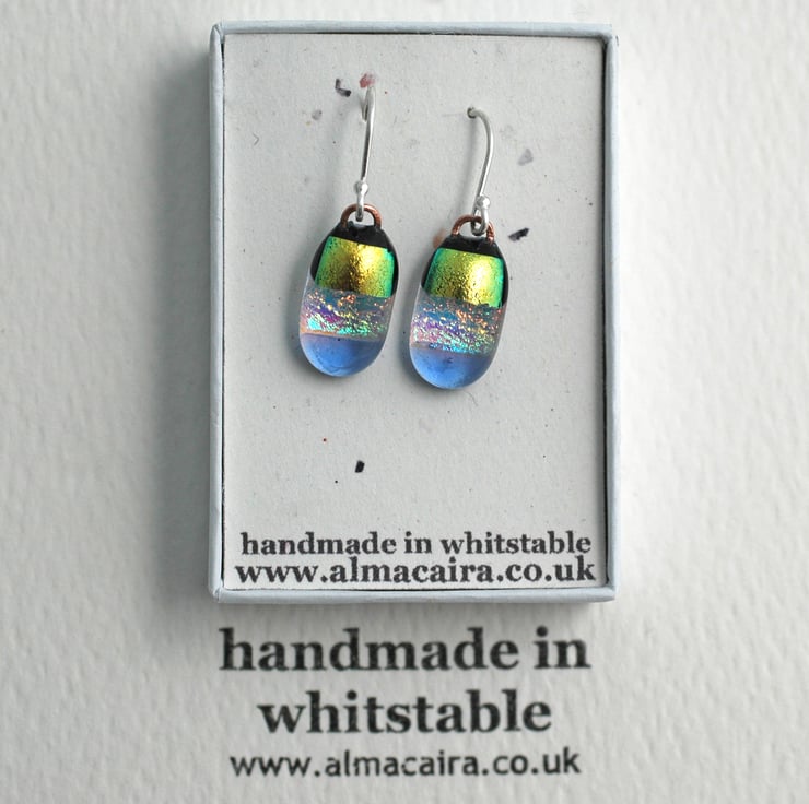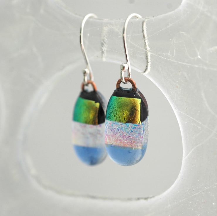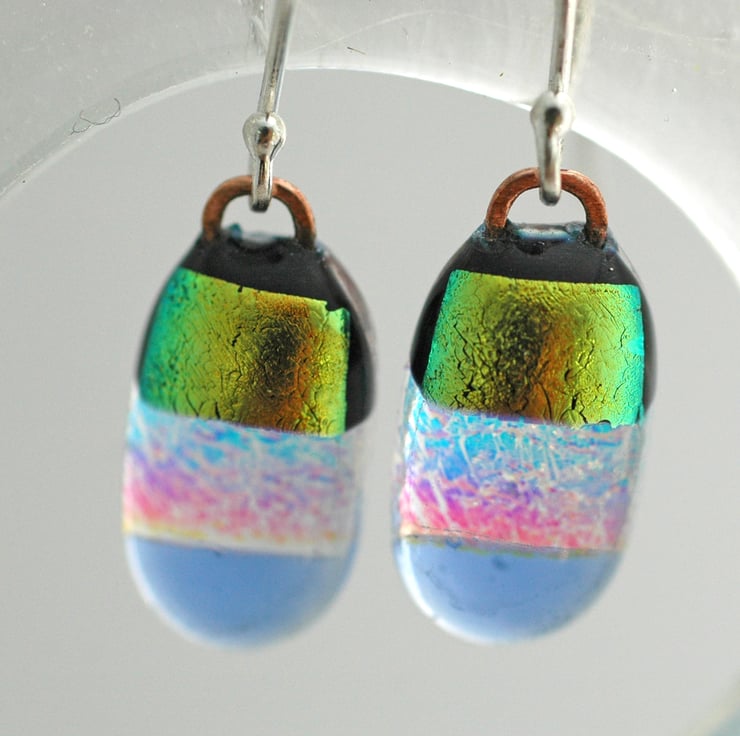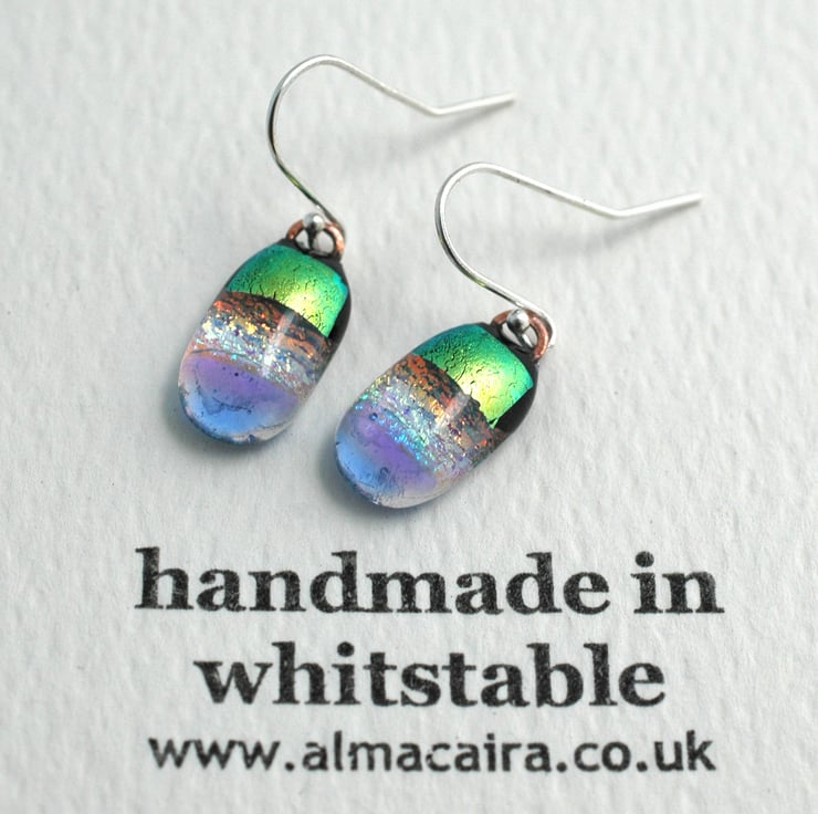 Created from layered Bullseye glass in my Whitstable workshop. Sterling silver ear wires. This is a gorgeous, multicolour dichroic design.