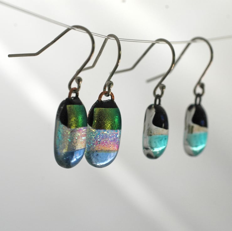 I love the beautiful colour range of Bullseye glass, some of my dichroic earring designs remind me of iridescent beetles, the colours just shimmer.