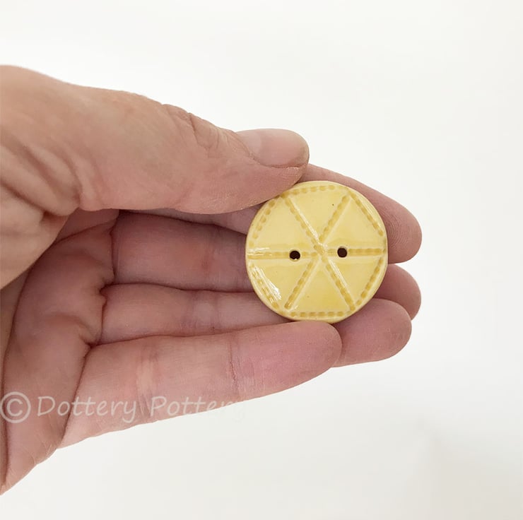 This set of four pottery buttons are made from white earthenware clay, embossed and glazed on the front. The pattern has been hand decorated so may not be perfectly symmetrical. They are then fired to 1100 degrees, so nice and strong. They measure 2.8cm. They can be handwashed or machine washed on a low temperature. Perfect for all sorts of arts and craft projects
