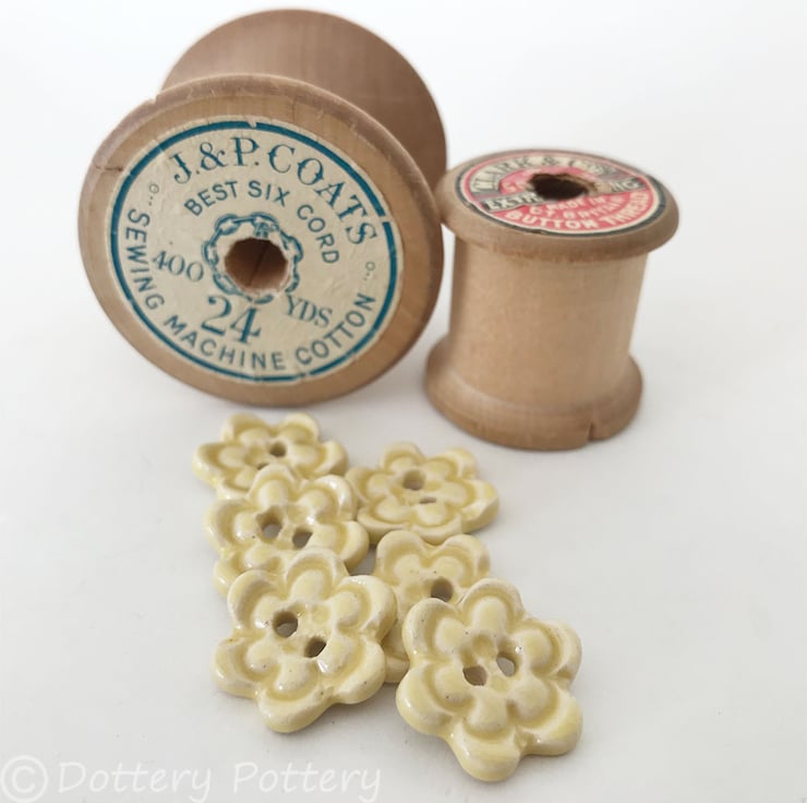 This set of six flower shaped pottery buttons are made from white earthenware clay, embossed and glazed on the front. They are then fired to 1100 degrees, so nice and strong.They measure 2cm diameter.They can be handwashed or machine washed on a low temperature. Perfect for all sorts of arts and craft projects.