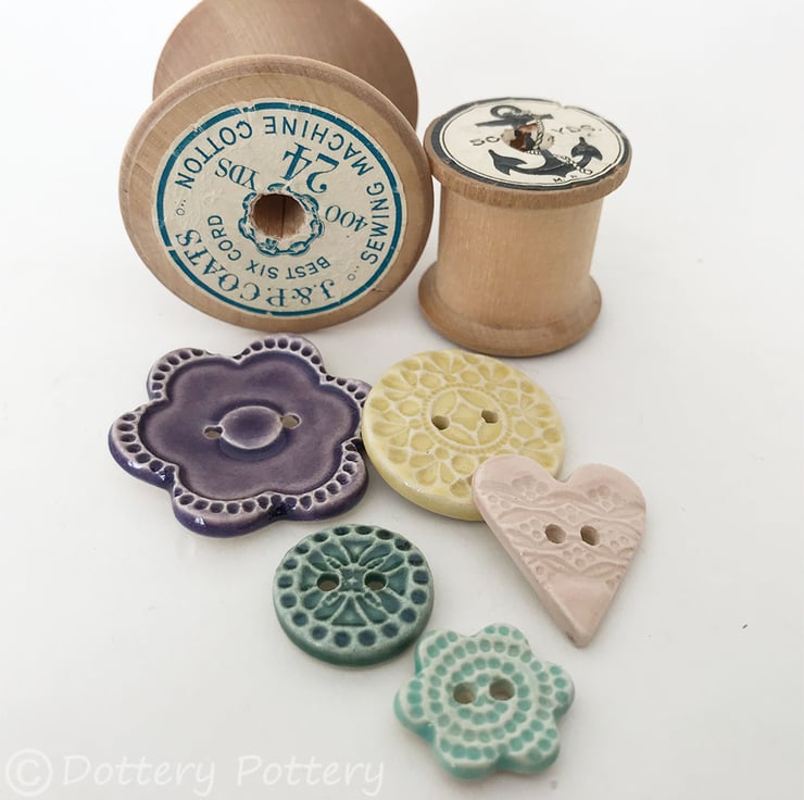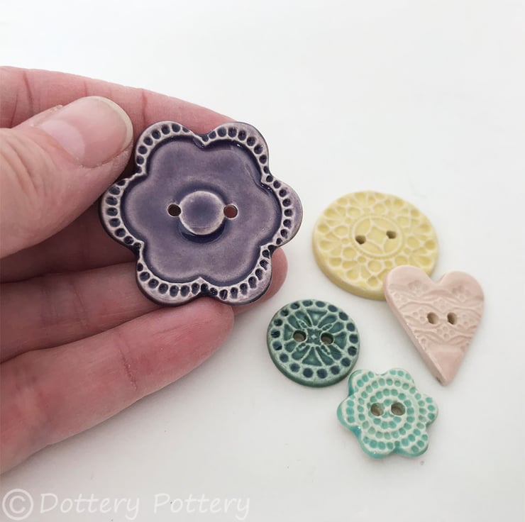 This set of five pottery buttons are made from white earthenware clay, embossed and glazed on the front. They are then fired to 1100 degrees, so nice and strong.They measure from 3.8cm - 2cm diameter.They can be handwashed or machine washed on a low temperature. Perfect for all sorts of arts and craft projects.