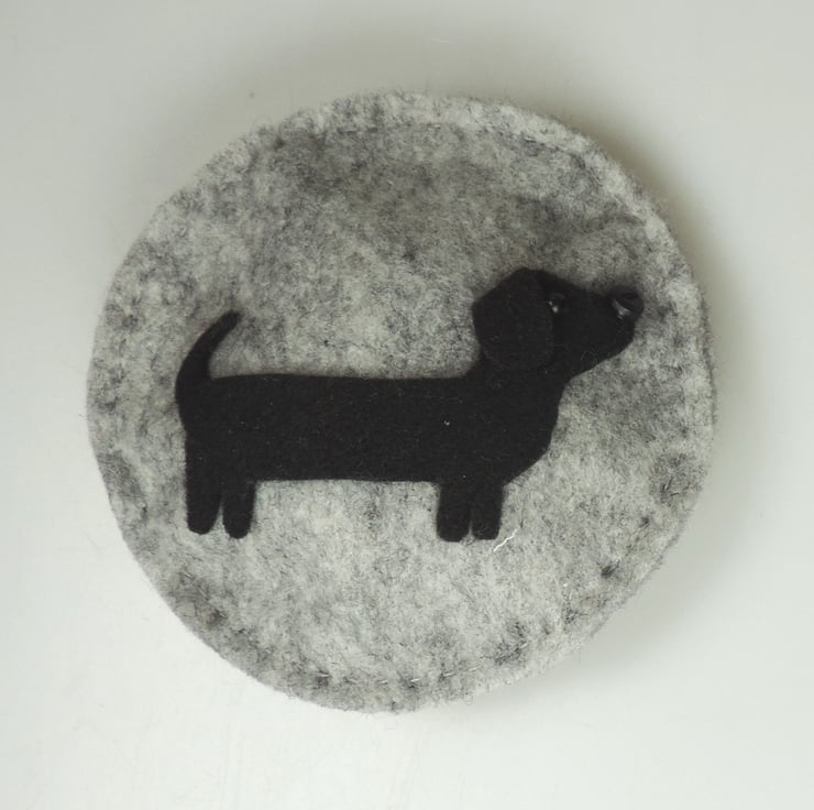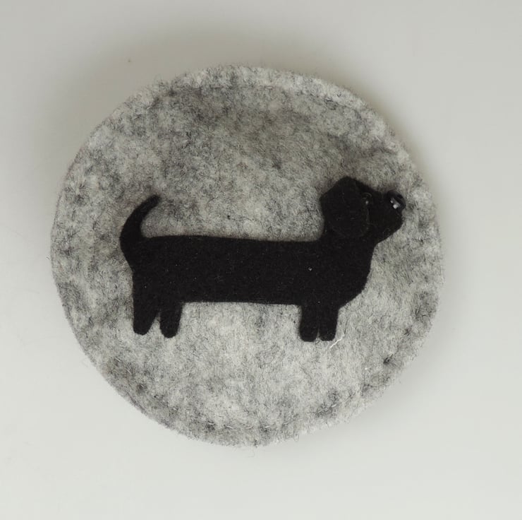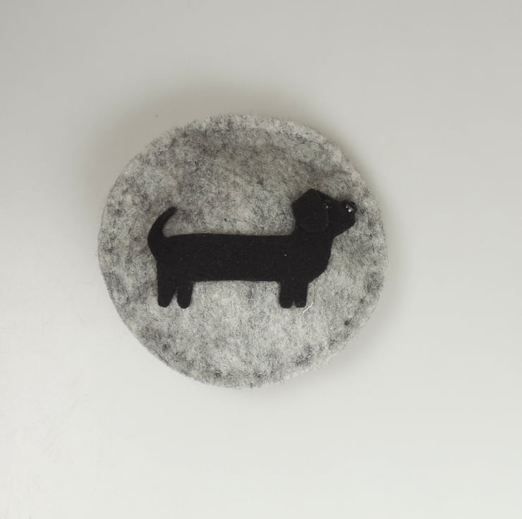 Handmade Felt round lavender pebble, with a standing Dachshund dog decoration on the front, embellished with bead eye and a button nose.