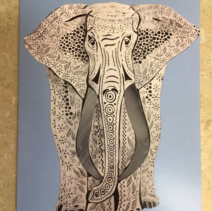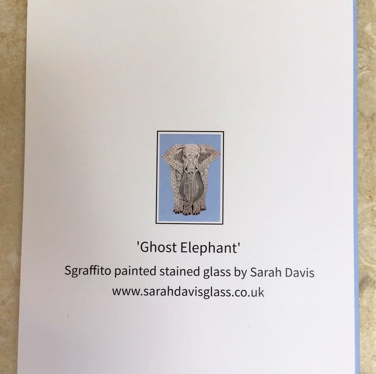 A high quality printed greetings card with a stylish image of a decoratively painted glass 'Ghost Elephant' against a blue background. Ideal for birthdays and other special occasions.