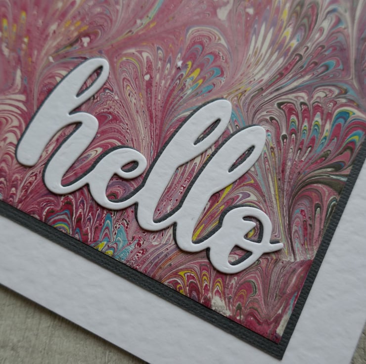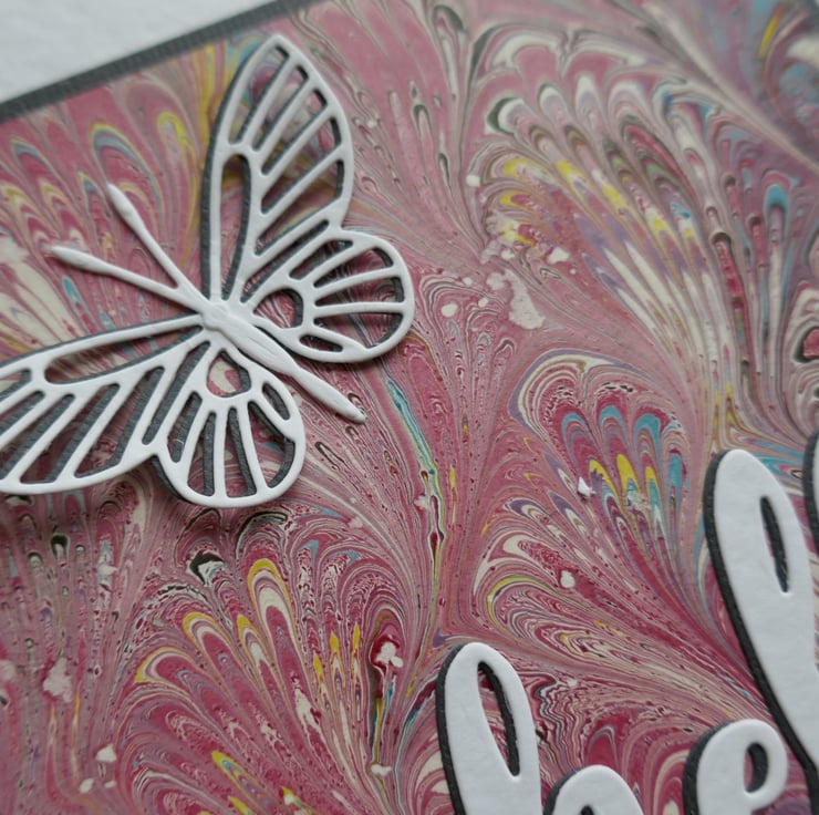 The beautiful marbled paper from the Whimsical Marbler is predominantly pink with blue, yellow and maroon marbling and this has been layered onto grey card. The 'Hello' sentiment has been die cut in both white and grey - the white is overlaid onto the grey to form a shadow. The butterfly has also been die cut in both white and grey to give the same shadow effect..