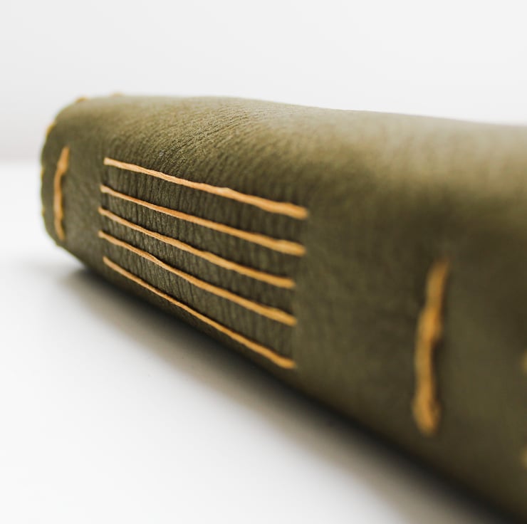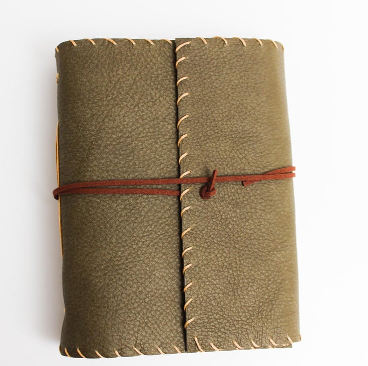 Gorgeous dark green very soft to the touch leather with a brown/green and grey floral material lining attached. The notebook is hand stitched around the edge and contains 100 blank sheets of 190g white water artwork paper which are then hand stitched to the leather in 5 signatures. The notebook is fastened with a brown suede cord, tied loosely at the front.
