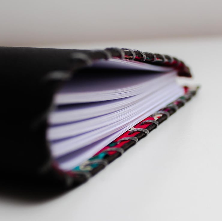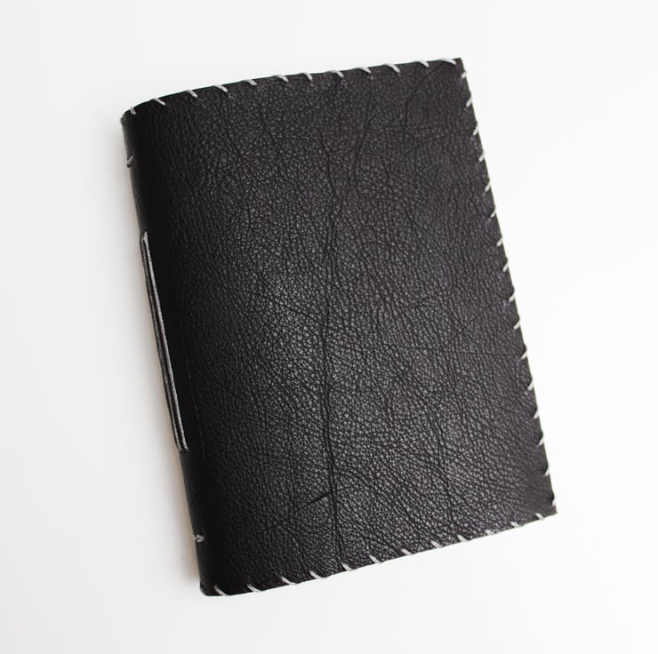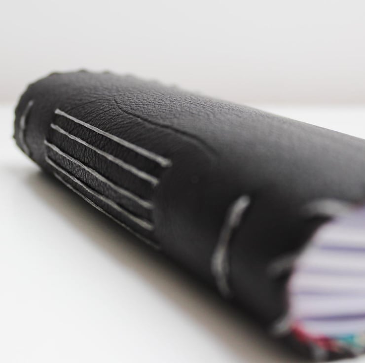 A dark brown/black leather with a navy, red and teal floral material lining attached. The notebook is hand stitched around the edge and contains 200 blank sheets of plain white paper which are then hand stitched to the leather in 5 signatures.