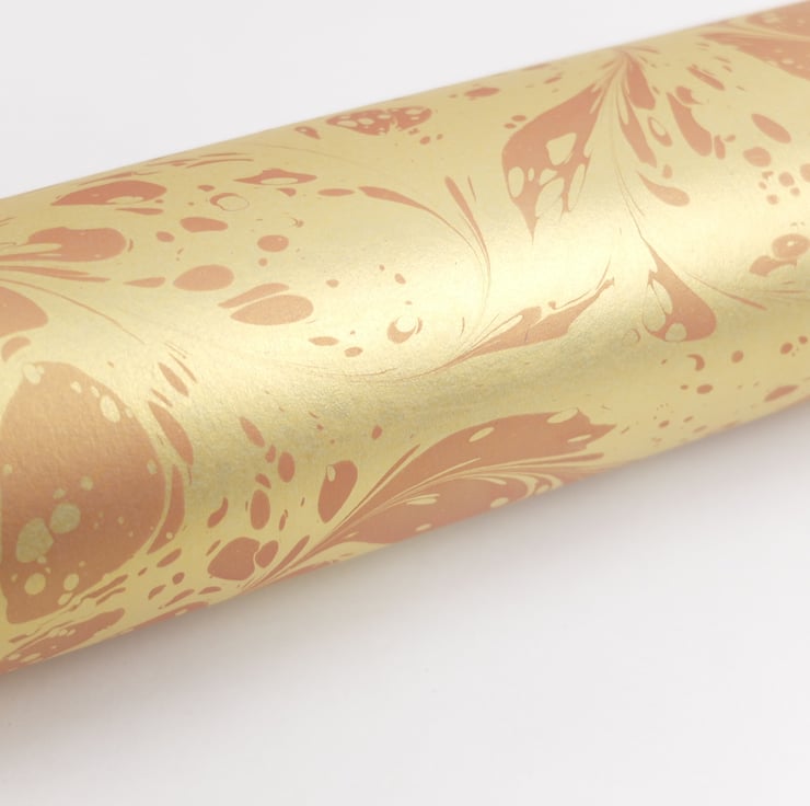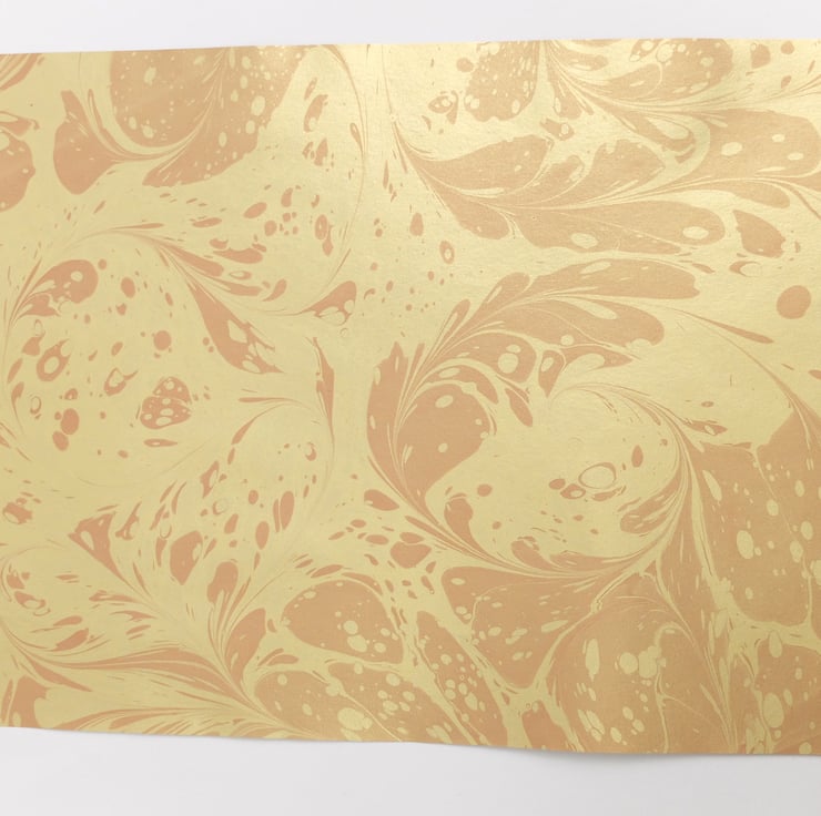 Marbled onto 120gsm metallic gold base paper made in the UK. The sheet is approx a4 sized, 296mm x 209mm, long grain.
