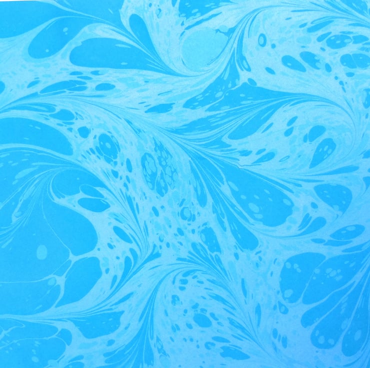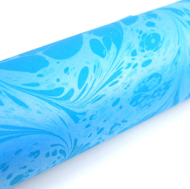 Marbled onto 135gsm blue base paper made in the UK. The sheet is approx a4 sized, 295mm x 210mm, short grain.