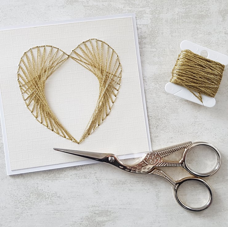 - Hand stitched with shimmering gold metallic threads, the card captures light beautifully and gives it a tactile feel.