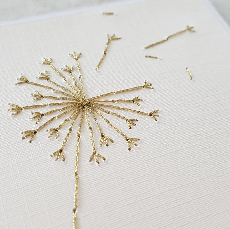 - Hand stitched with shimmering gold metallic threads, the card captures light beautifully and gives it a tactile feel.