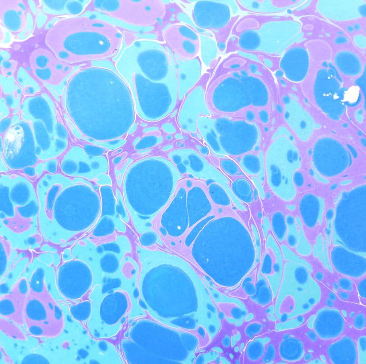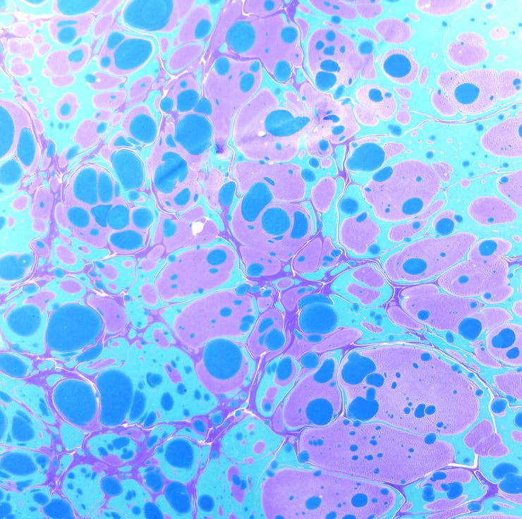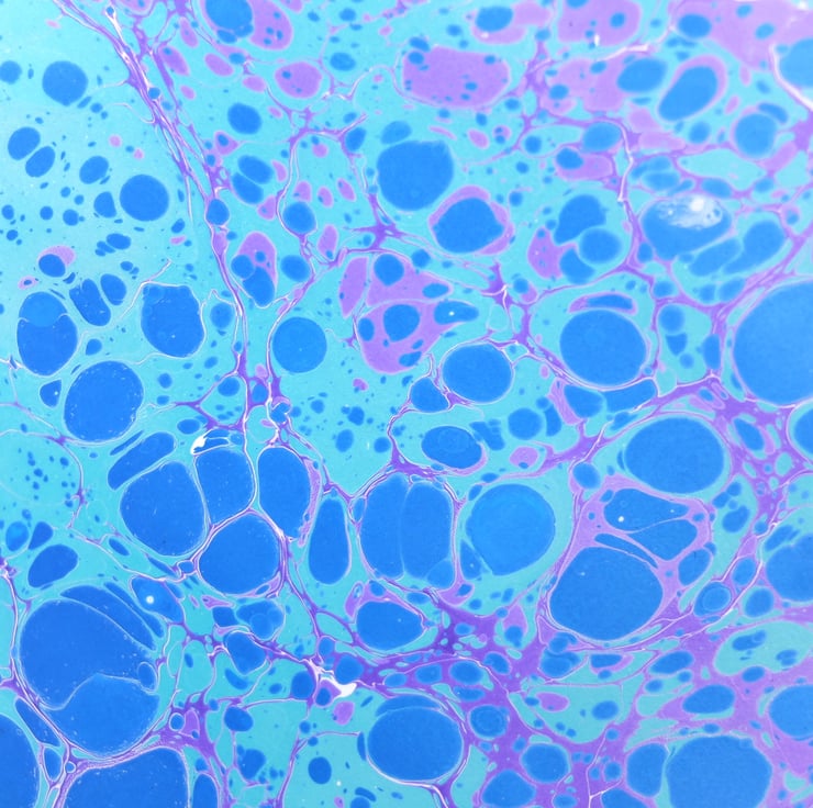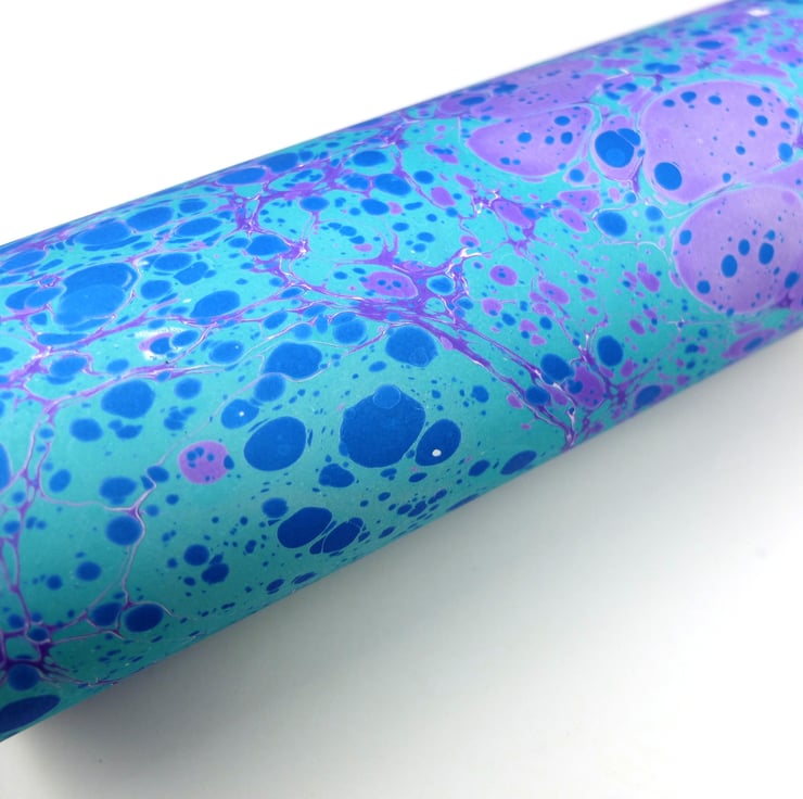 Marbled onto 140gsm FSC white base paper made in the UK from recycled coffee cups. The sheet is approx 216mm x 305mm, short grain.