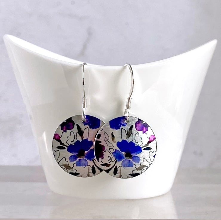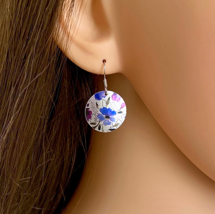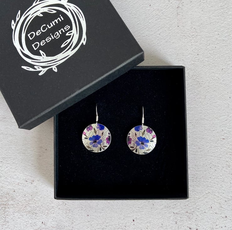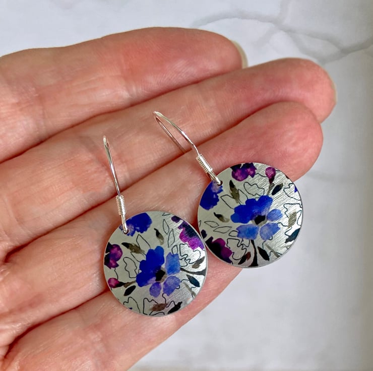 I have handmade the discs and artwork for these earrings, and the drops have a pretty purple floral design. An ideal gift for nature lovers. Matching bracelet and pendant available.