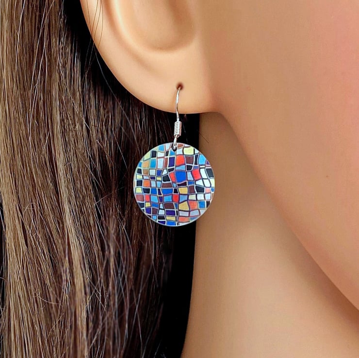 I have handmade the discs and artwork for these earrings, and the drops have a multi coloured mosaic design. An ideal gift for someone who likes unusual jewellery. Matching bracelet and pendant available.