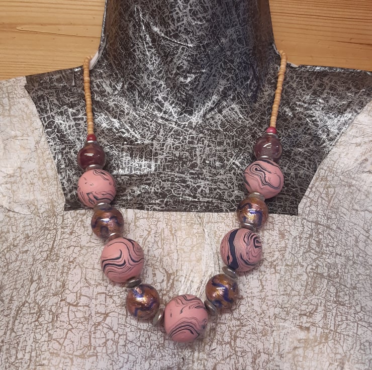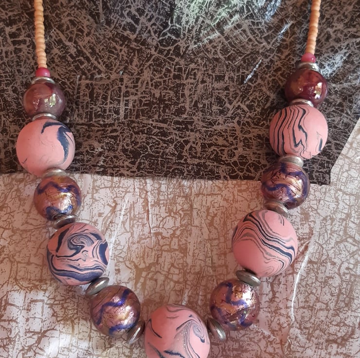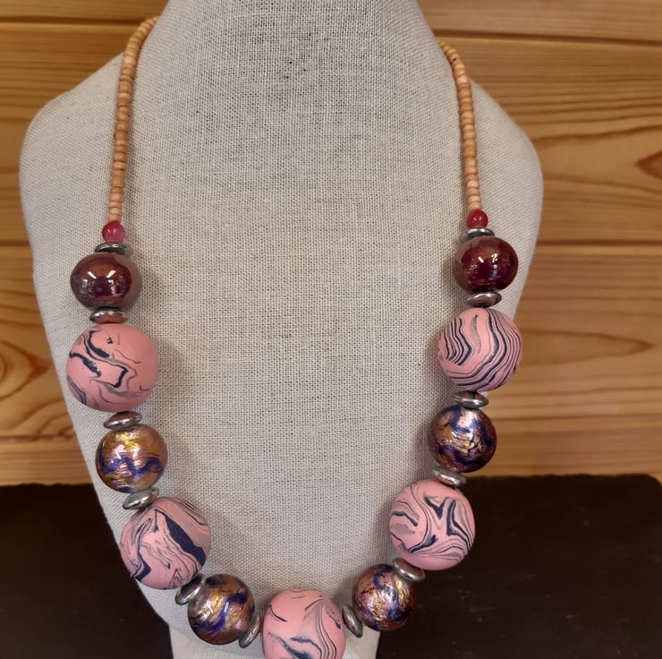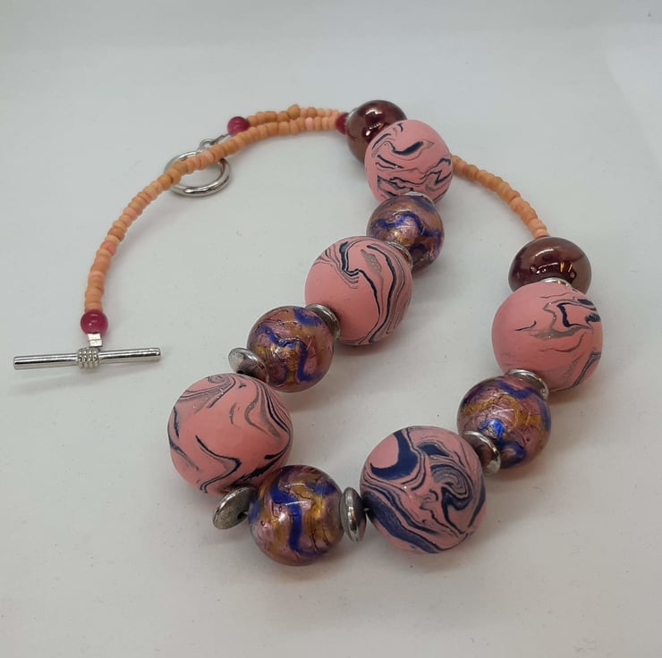 This uniquely designed handmade necklace comprises 5 chunky pink and navy swirl polymer clay beads with a hint of sparkle. Each bead measures approx. 22mm alternating with 17mm pink/purpley blue and gold foil glass beads.