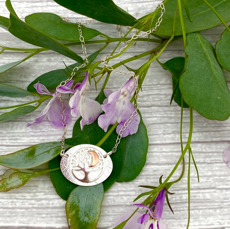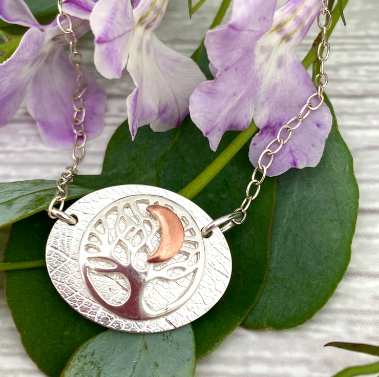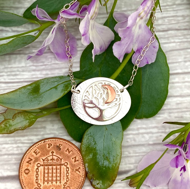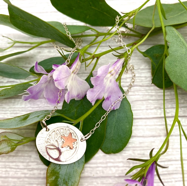 Made using a saw, a file, a hammer, pliers, a drill, silver solder and quite a bit of elbow grease . This statement 16" necklace is light enough to wear as an everyday piece and is perfect for celestial dreamers and those of you who like stars & trees. The pendant is approx 12 mm from top to bottom.