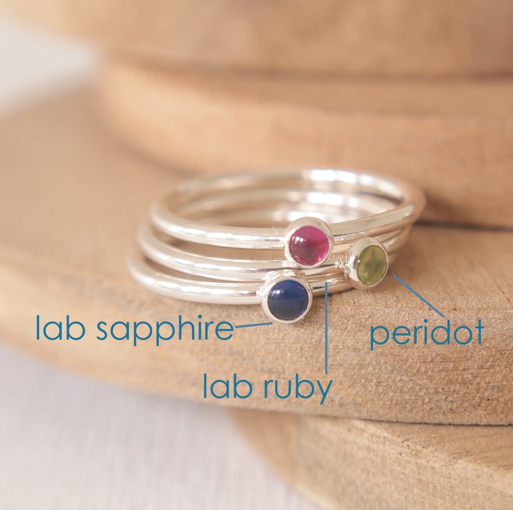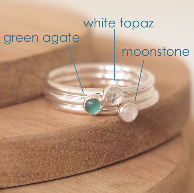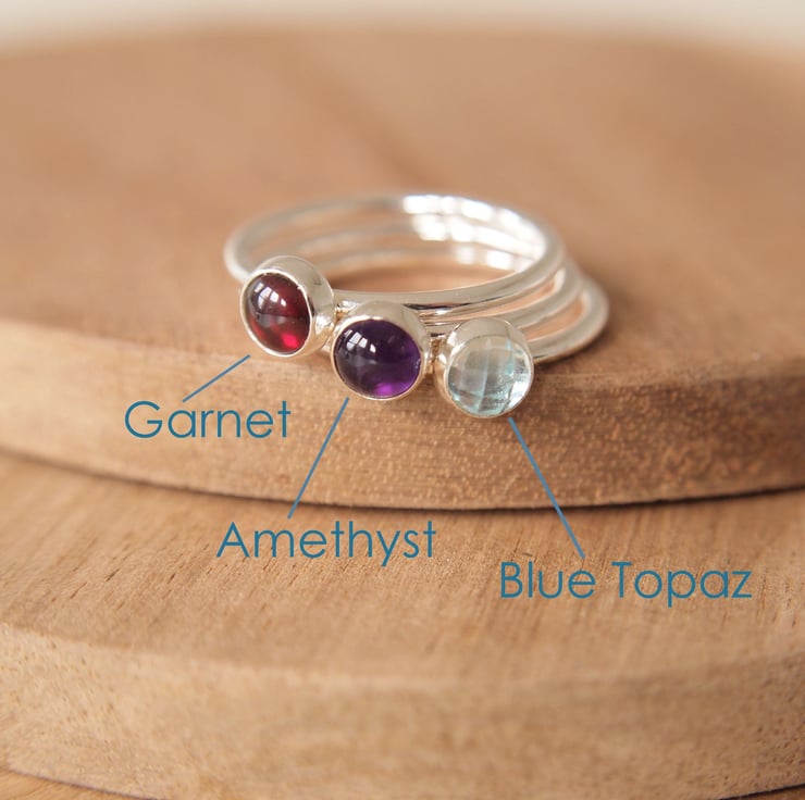 Made from Sterling Silver this ring set contains three gem set rings in Sterling Silver with one stone, usually the Mother's, as a 5mm size and two smaller gem set rings with 3mm stones to mark children, grandchildren or whoever you wish!