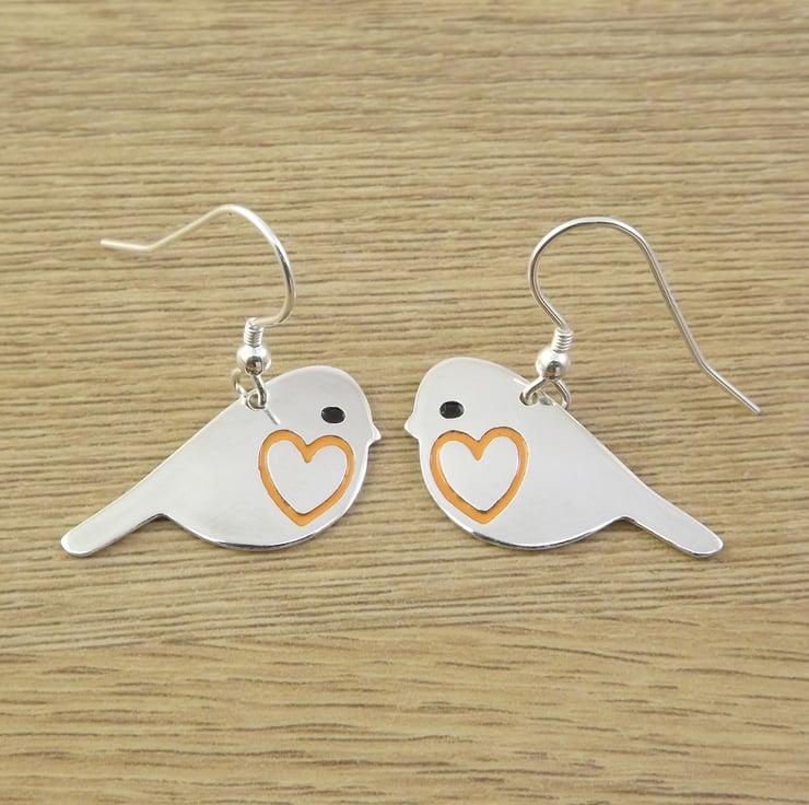 These robin drop earrings have been lovingly crafted in Shropshire. They are handmade from recycled sterling silver and are etched before being cut by hand, the edges are then smoothed using files and emery paper before the earrings are carefully given their shape using a punch and hammer. Black and orange resin based enamels are added to the etched areas and then the earrings are polished before being attached to ear wires.