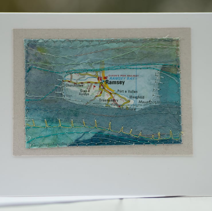 The map is embedded in other papers, painted with inks and embellished with a variety of stitches to create a card with a lovely blue- green coastal vibe. This would be perfect to frame and display in any setting, especially if Ramsay is special to you.