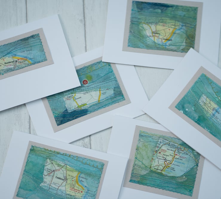 The map is embedded in other papers, painted with inks and embellished with a variety of stitches to create a card with a lovely blue- green coastal vibe. This would be perfect to frame and display in any setting, especially if Douglas is special to you or the recipient.