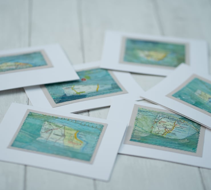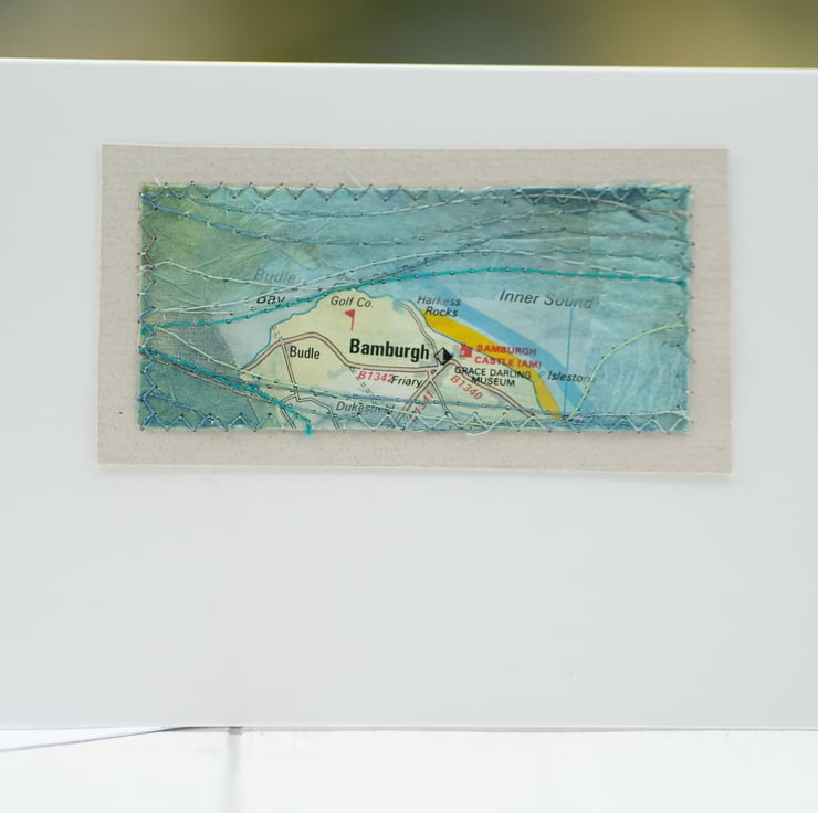 The map is embedded in other papers, painted with inks and embellished with a variety of stitches to create a card with a lovely blue- green coastal vibe. This would be perfect to frame and display in any setting, especially if BAMBURGH is special to you or the recipient.