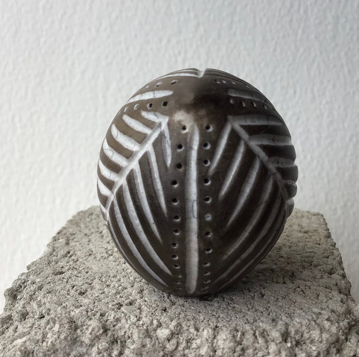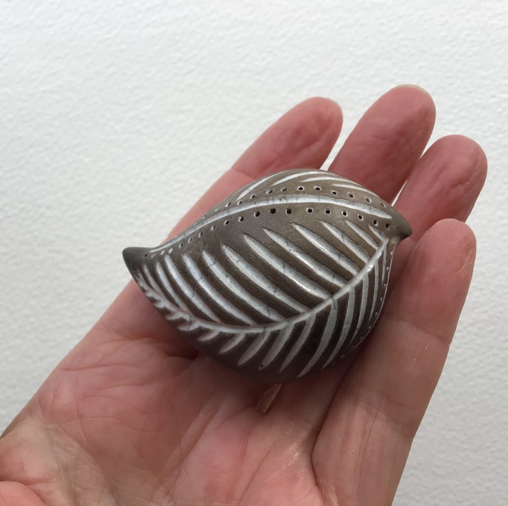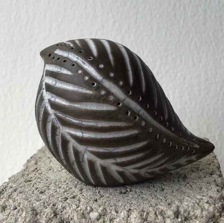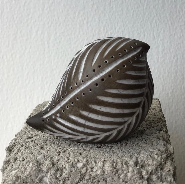 This bird is hand made and measures approx, 3.5cm high and 5.5cm long. It is made from white earthenware clay and carved before being fired in an electric kiln, it is then covered in white raku glaze which when dry is wiped back leaving the glaze in the carved indents, it is then raku fired in a gas kiln, the black part of the bird has been sanded and is unglazed and polished with beeswax.